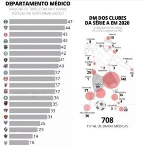 No total, o Atlético-GO teve 16 baixas médicas no Campeonato, comparando com o primeiro colocado dessa lista, o Grêmio, que sofreu 47 baixas médicas.