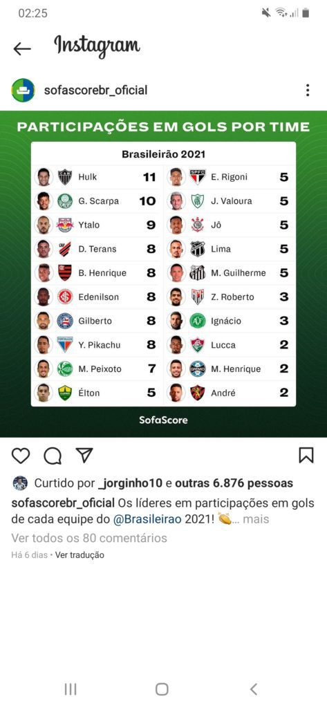 Já o São Paulo tem cinco participações de gols na Série A do Campeonato Brasileiro, mesma coisa o Corinthians com cinco participações por gol no certame nacional. Além do meia Lima, do Ceará, que apresenta cinco participações por gol no torneio nacional.