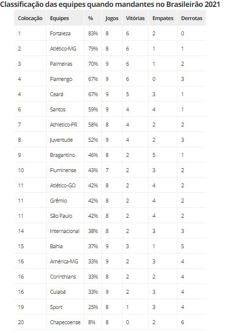 De acordo com a tabela do Espião Tático, do site Globo Esporte, mostra como está a classificação dos times como mandante da Série A do Campeonato Brasileiro. Principalmente quem tem a melhor campanha atuando em seus domínios, durante a sequência do certame nacional.