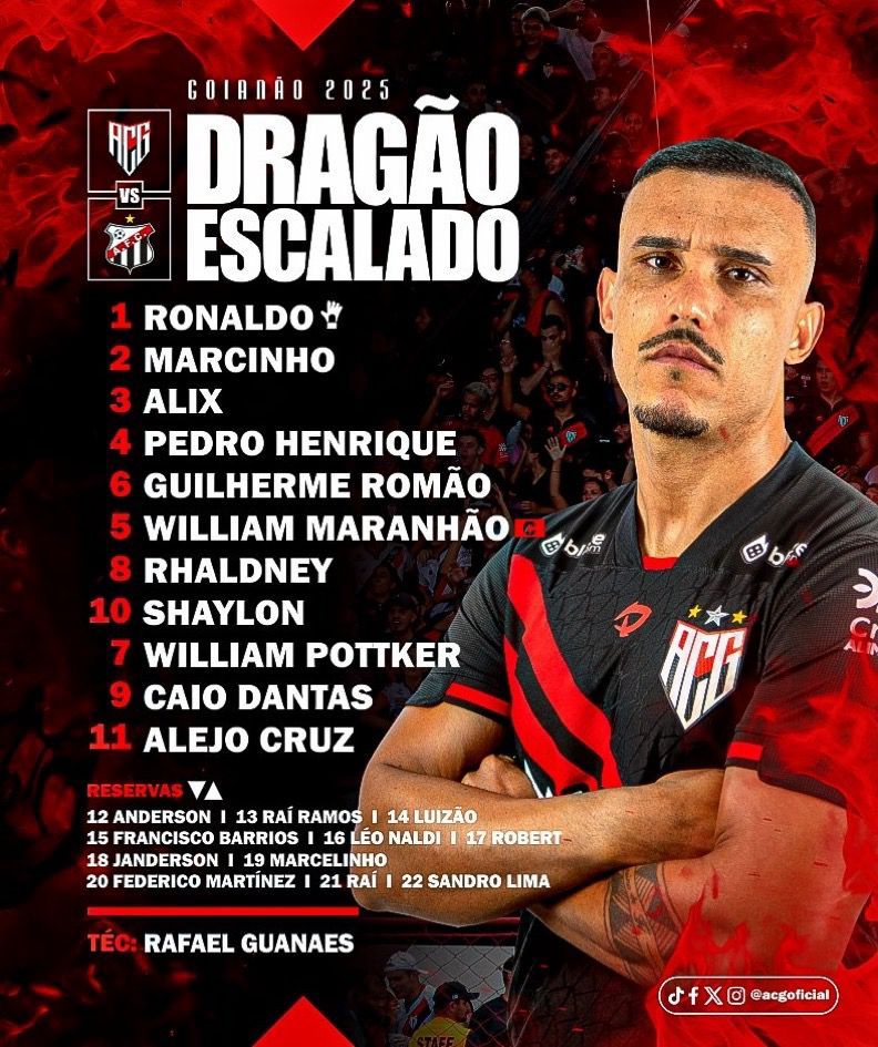 O treinador atleticano vai mandar à campo a seguinte escalação: Ronaldo; Marcinho, Alix, Pedro Henrique, Romão; William Maranhão, Rhaldney, Shaylon; William Pottker, Caio Dantas, Alejo Cruz.