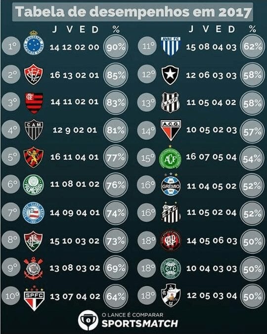 Para isso, buscamos as informação do aplicativo SPORTSMATCH que fez um levantamento levando em conta exclusivamente o aproveitamento dos clubes na atual temporada.