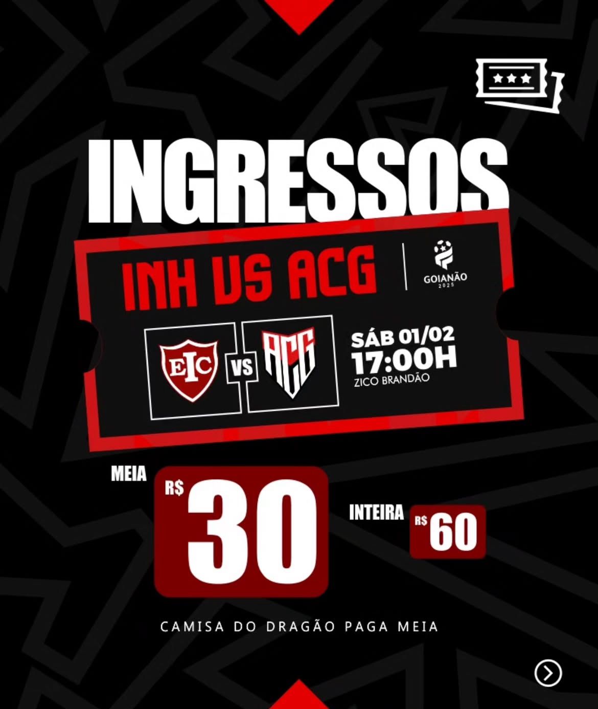 Os bilhetes custam 60 reais a inteira e 30 reais a meia-entrada, válidas para quem for ao jogo com a camisa do Atlético e Goianésia.