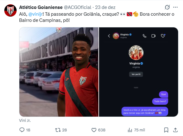 O craque do Real Madrid, Vinícius Júnior está em Goiânia acompanhado de sua namorada Vírginia Fonseca. Dessa maneira, o Atlético-GO famoso por viralizar nas redes sociais com brincadeiras repercutiu ao chamar o jogador para conhecer o bairro de campinas.