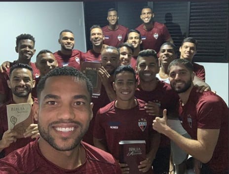 Durante a concentração para o jogo contra a Aparecidense, no Centro de Treinamento do Urias Magalhães, uma novidade aconteceu com os jogadores do Atlético-GO. Parte dos atletas posaram para uma selfie e cada um com uma Bíblia na mão.
