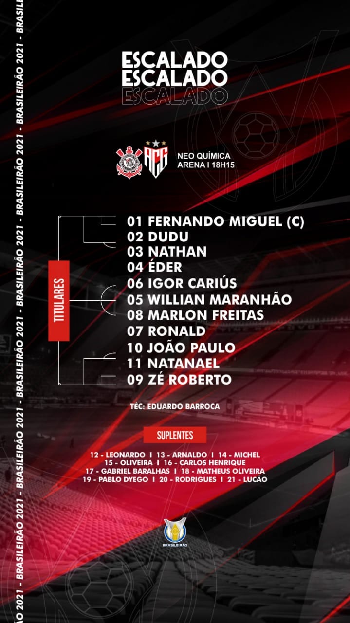 Neste domingo, Corinthians x Atlético-GO estarão em campo, às 18h15 (horário de Brasília), válido pela primeira rodada da Série A do Campeonato Brasileiro. Diante disto, a reportagem mostra na íntegra como os times estão escalados para o duelo no certame nacional.
