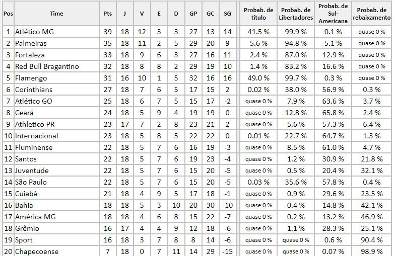 Diante disto, a reportagem mostra na íntegra tudo o que você precisa saber, quais as probabilidades e chances de cada time que está na Série A do Campeonato Brasleiro neste exato momento.